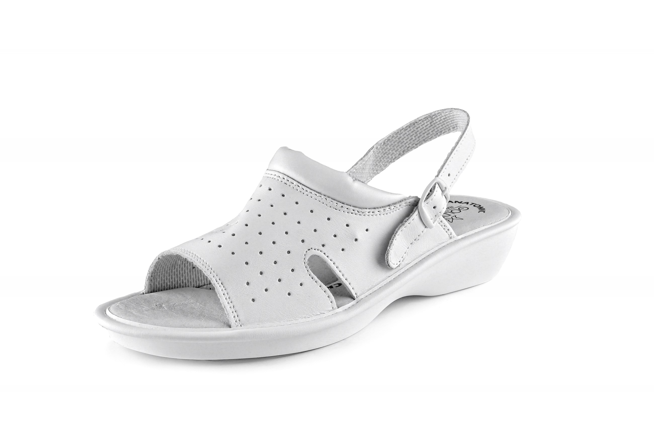 Сандалии женские, кожаные, перфорированные на каблуках, подошва с ПУ, белого цвета, размер 35-42.